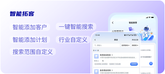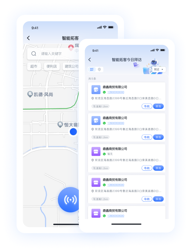 实时依据不同定位自动搜索附近潜客户,一键添加/拜访,降低拓客成本