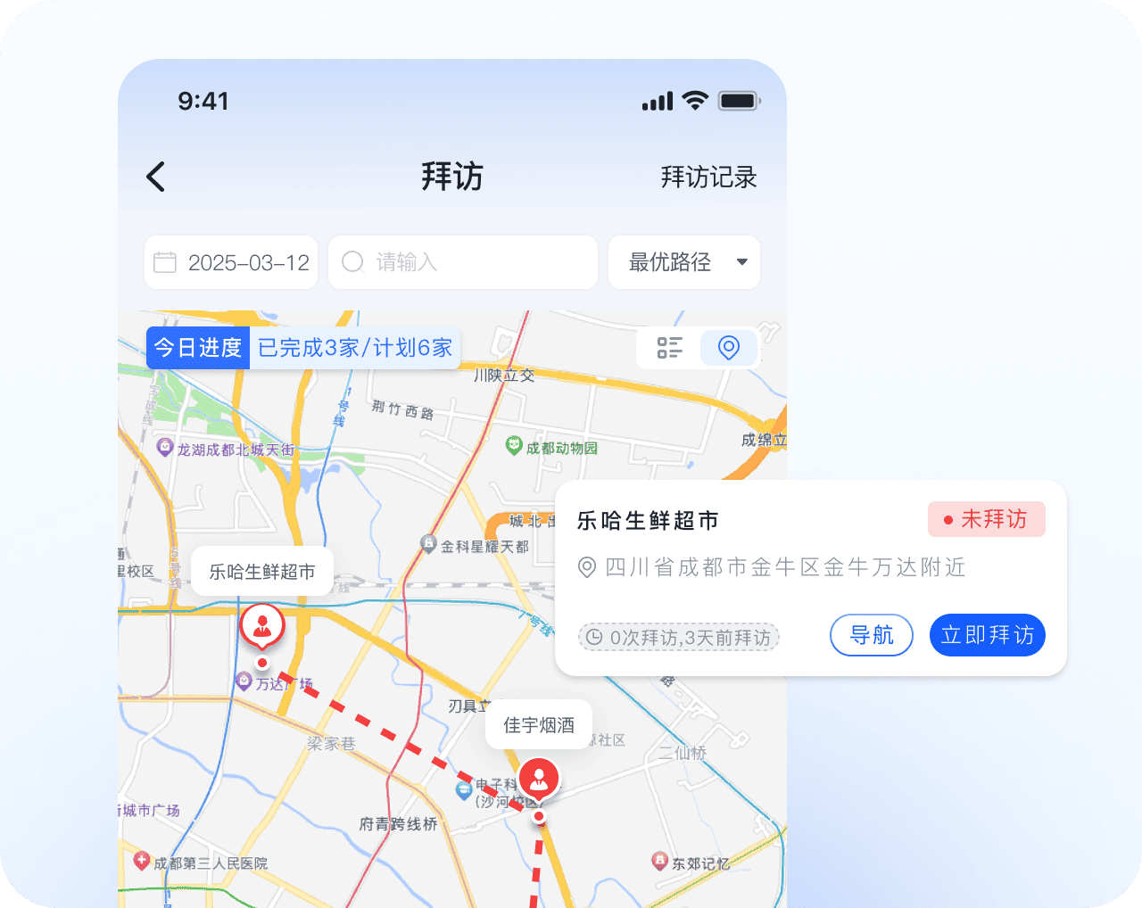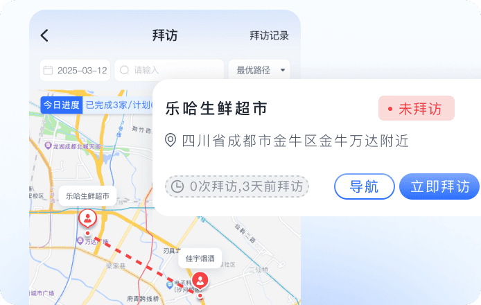 按客户画像自动推荐拜访名单、智能规划拜访路线,确保重要客户覆盖,按频次、按路线的周期性拜访计划,减轻排线工作量,拜访话术策略建议,提高拜访转化促进成单