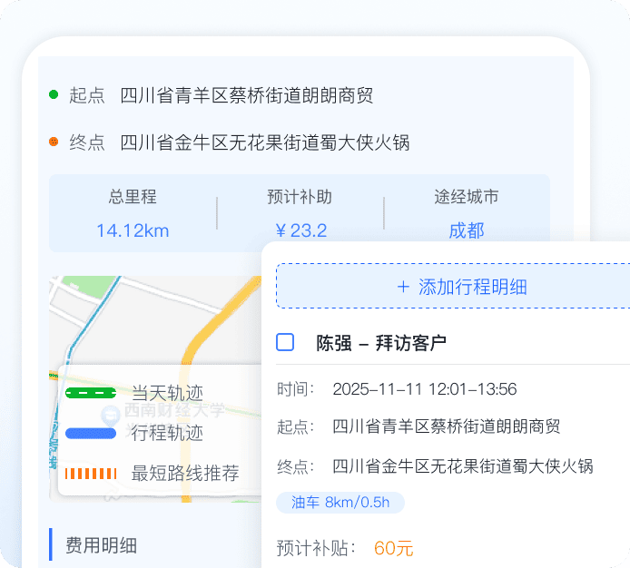 自动记录轨迹,无需手动操作;实际路线与规划路线智能比对,异常一目了然,关联轨迹自动核算里程与补贴,报销一键提交,行程即凭证,轨迹即依据,让每一公里都算数。